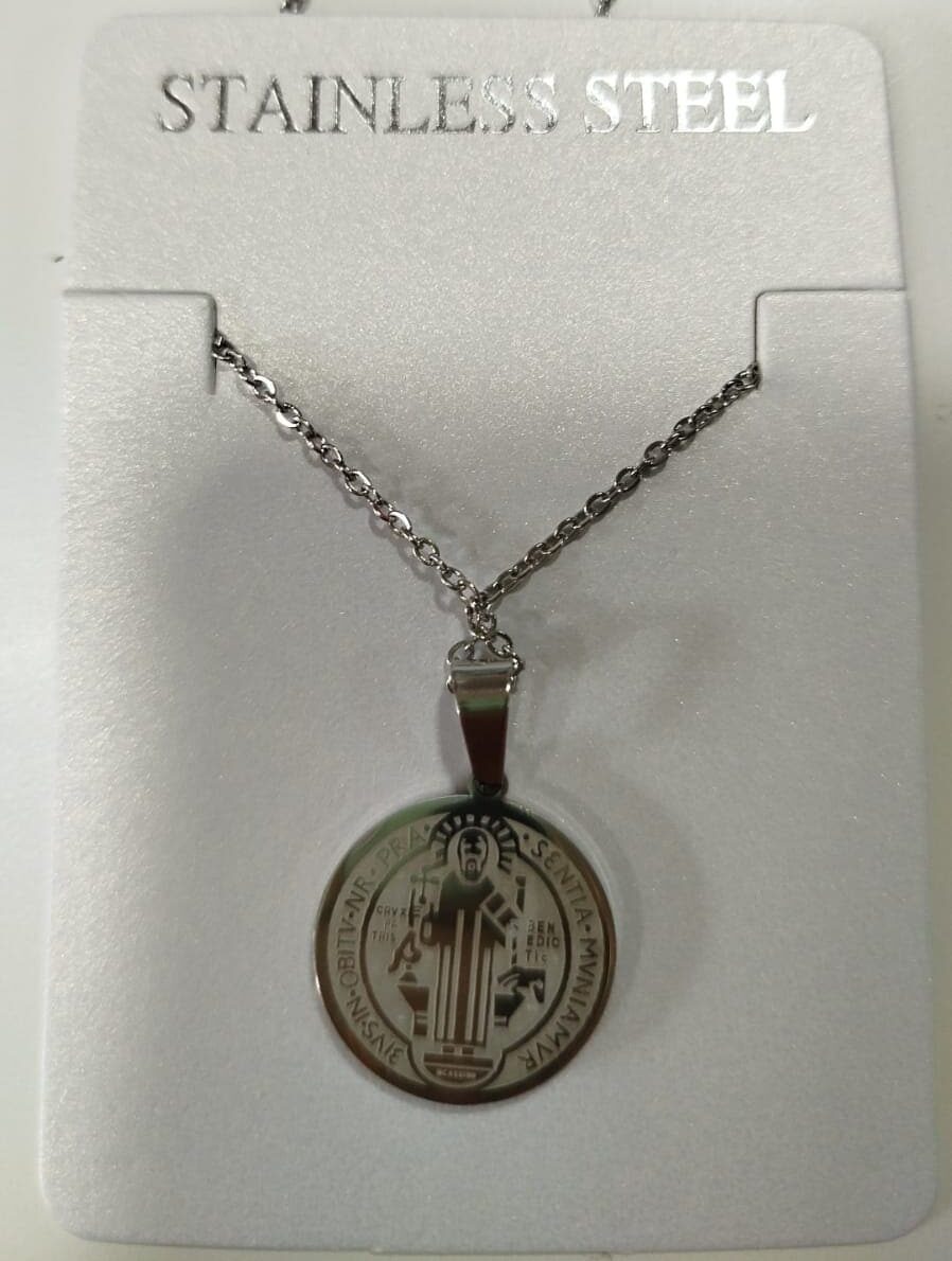 Colgante medalla de San Benito grabado en acero inoxidable con cadena